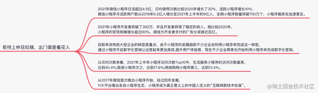 据 「中研网数据」 显示,2021 年微信小程序日活超过 4.5 亿,全网小程序数量突破 700 万个,小程序开发者突破 300 万,微信为开发者支付的广告分成接近百亿,小程序服务在加速普及。