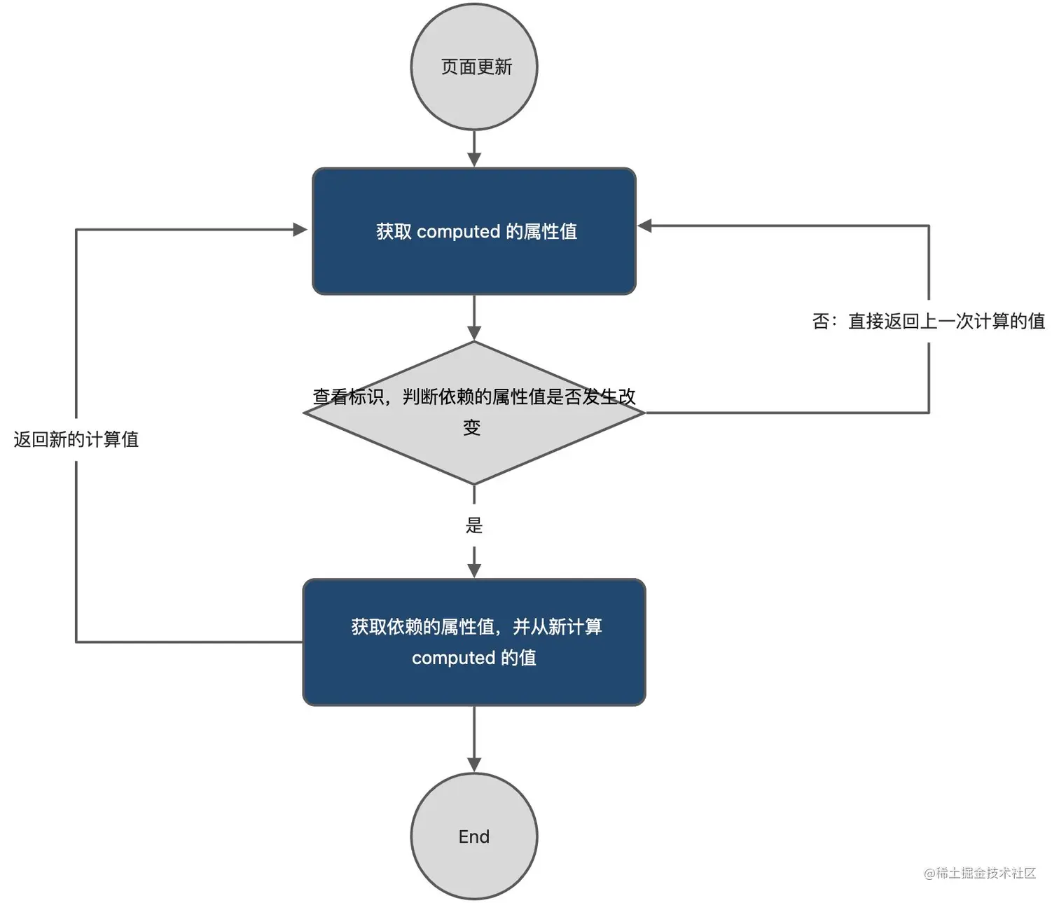 也许看到这里有同学还会产生一个疑问,computed 是怎么知道内部依赖产生了变化呢?这是由于在我们第一次获取 computed 值(即执行getter方法) 的时候对内部依赖进行了访问,在那个时候就对其进行了依赖收集操作,所以 computed 能够知道内部依赖产生了变化。
