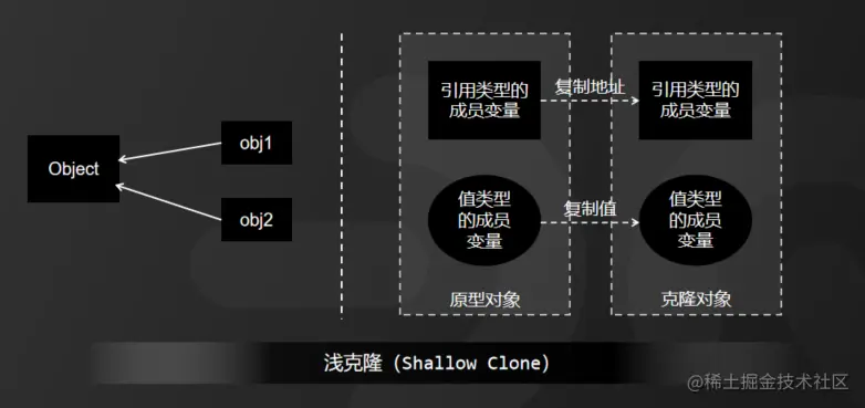 如图所示:有原型对象Object,它是引用类型,然后拷贝后产生两个克隆对象obj1和obj2,只是它们克隆的是Object的内存地址,因此ob1和obj2都指向Object,那么Object中的成员变量值发生改变时,obj1和obj2指向的成员变量值也就会发生改变。
