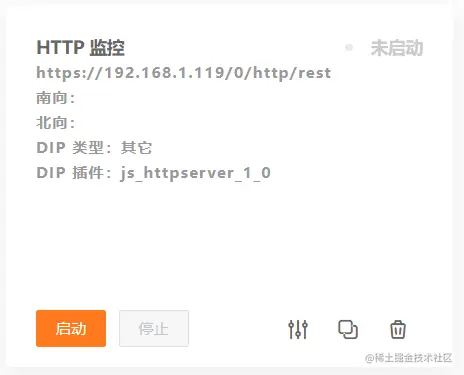 配置信息填写完成后,点击保存,成功保存后会在森数据DIX的数据集成页面看到HTTPServer的DIP已经存在。点击启动,便可以获取第三方的数据,并将处理后的数据发送到ThingJS平台。