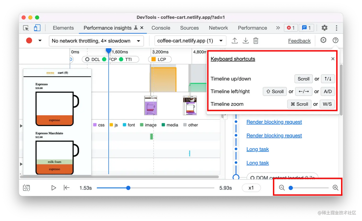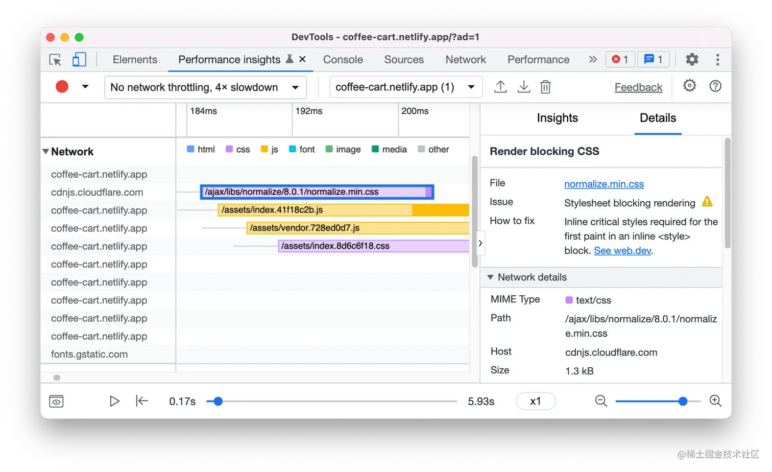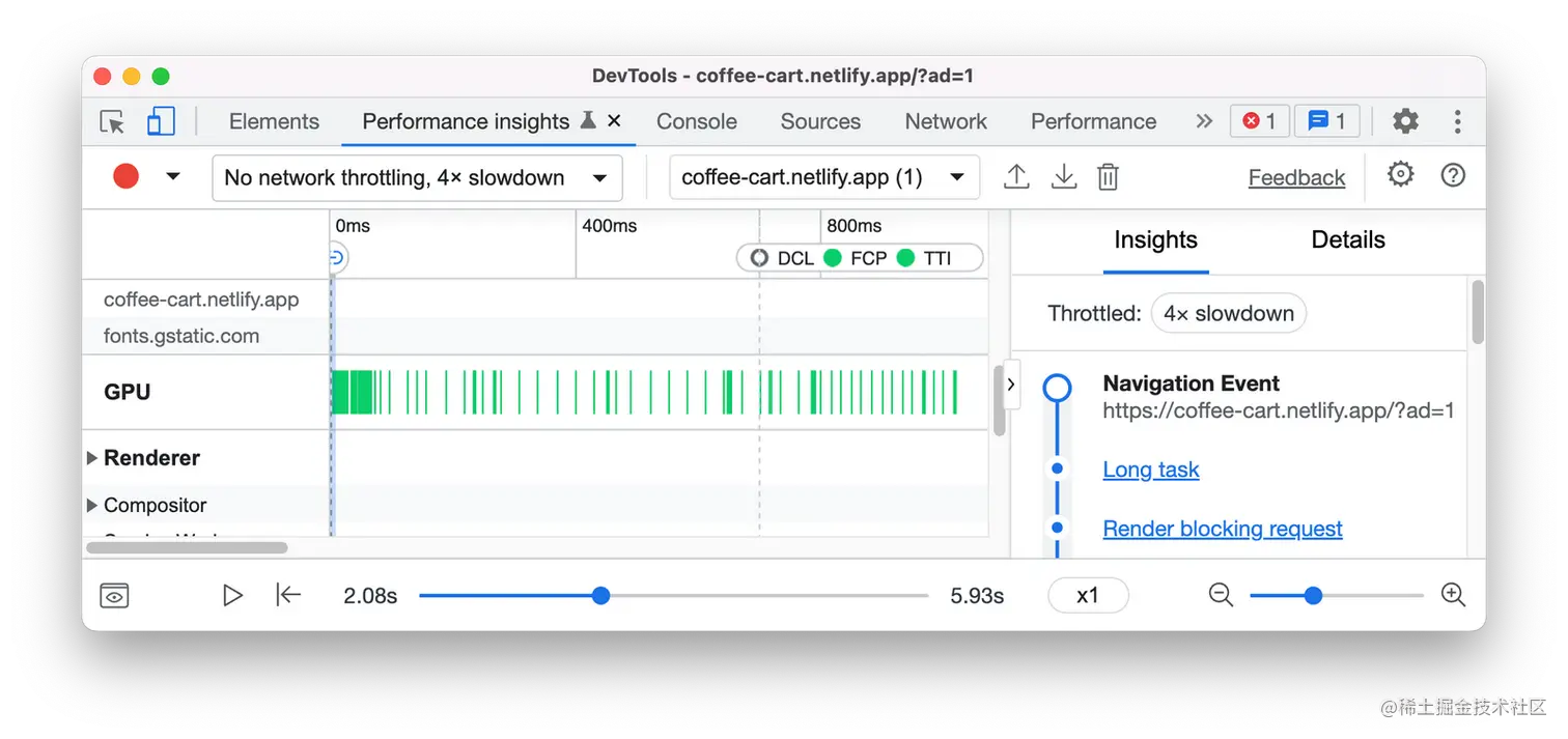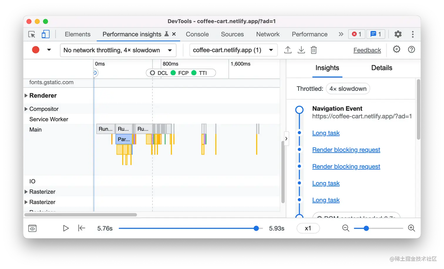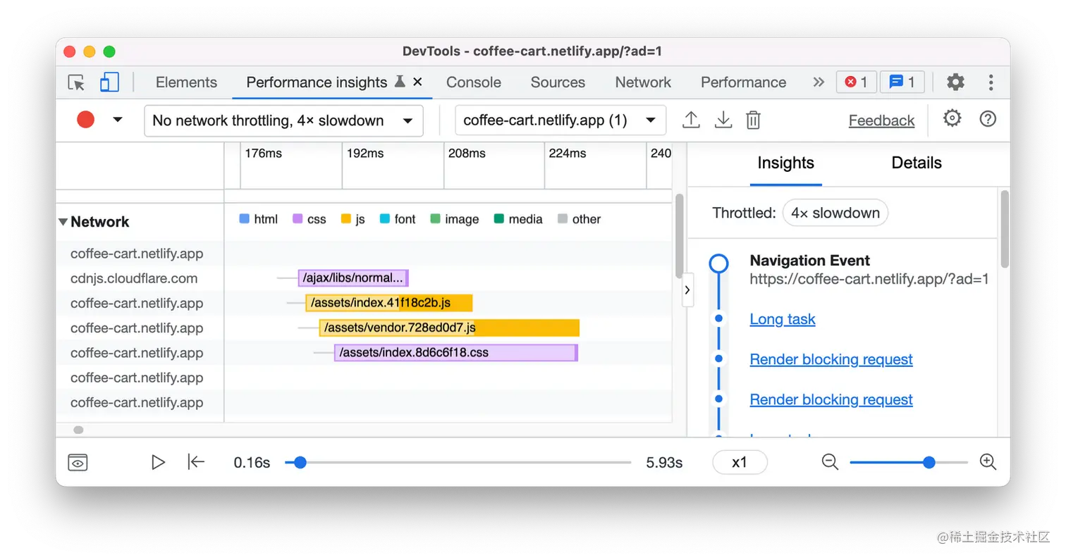 Performance insights采用流式并简洁的只展示页面渲染的相关信息。 -