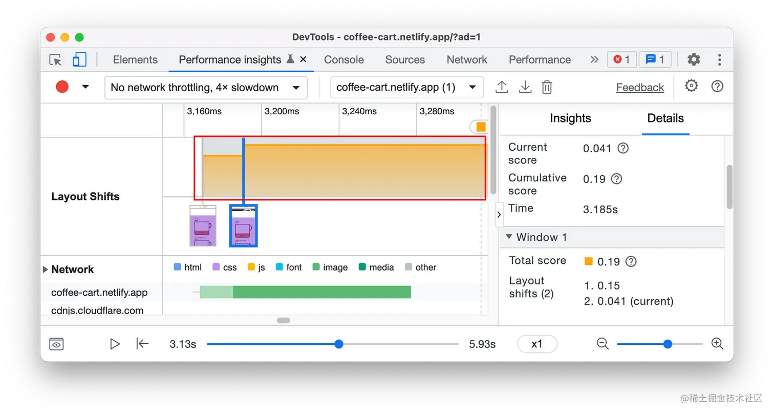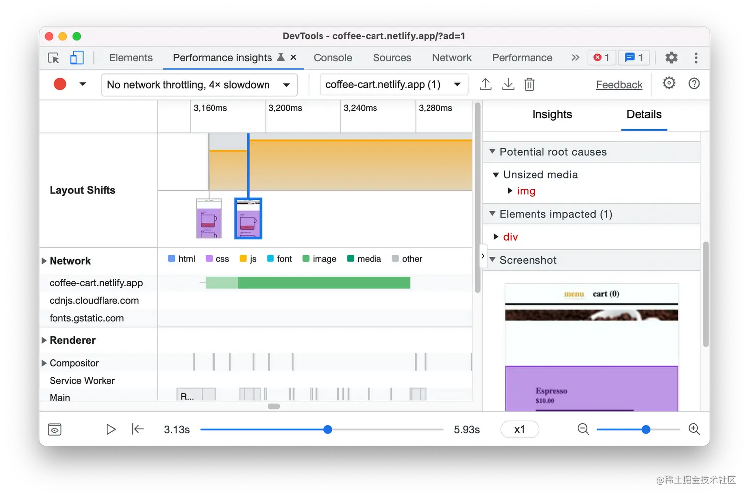 在这个例子中,潜在的根本原因就是unsized media,可以在优化累计布局偏移上了解如何修复它。