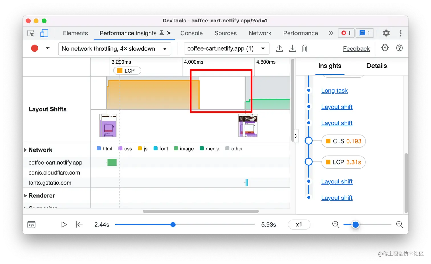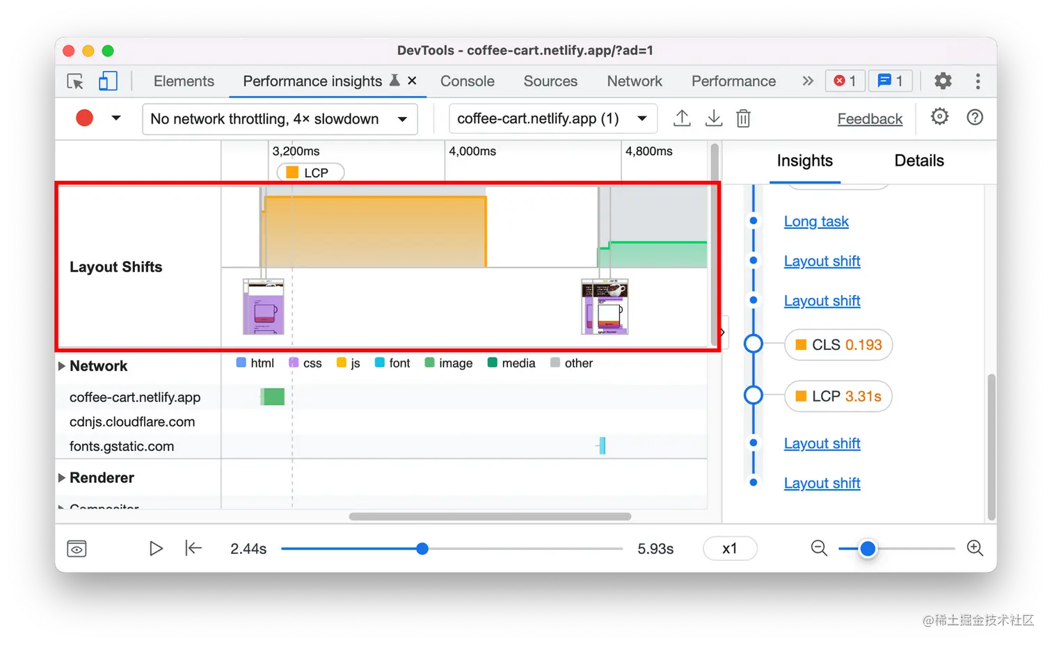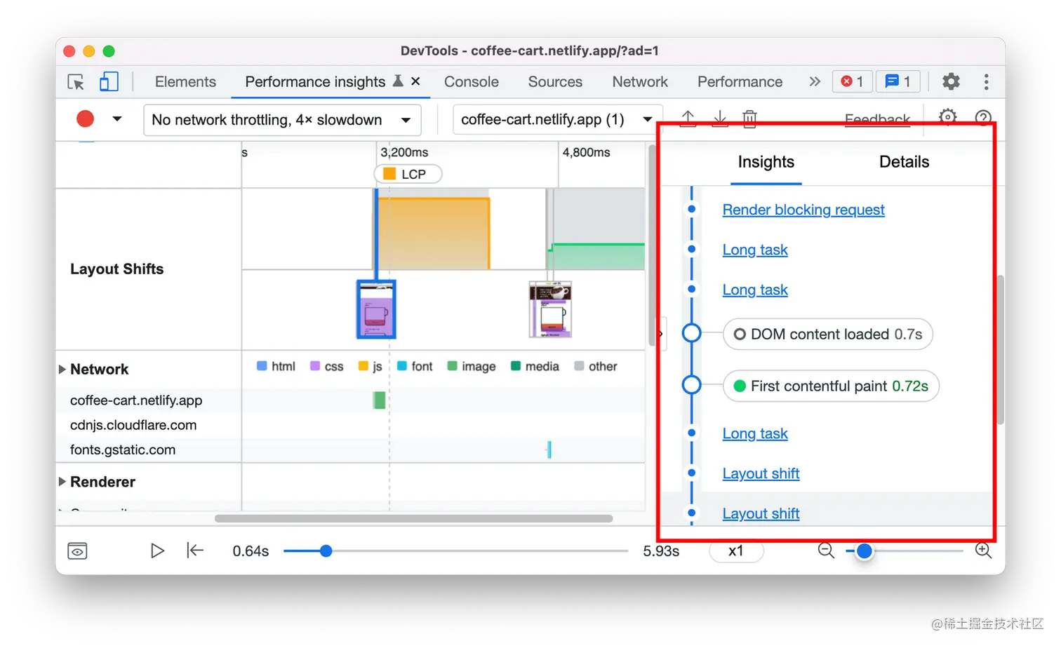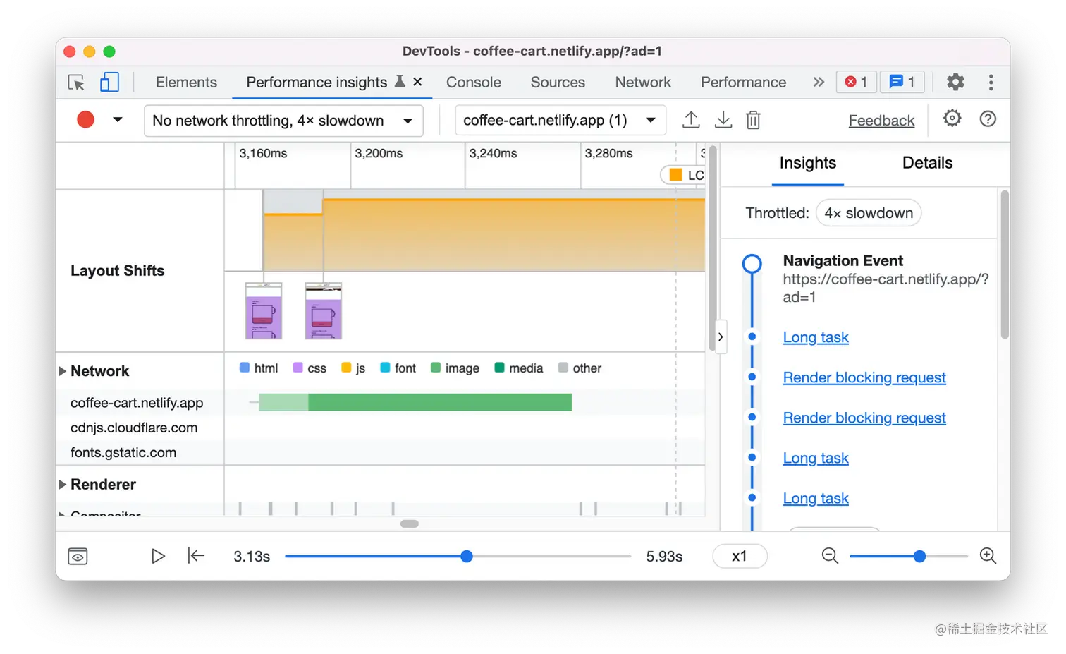 对比上面这个Performance而言,新的Performance insights是一个实验性的模块,用来解决三个开发者的痛点: