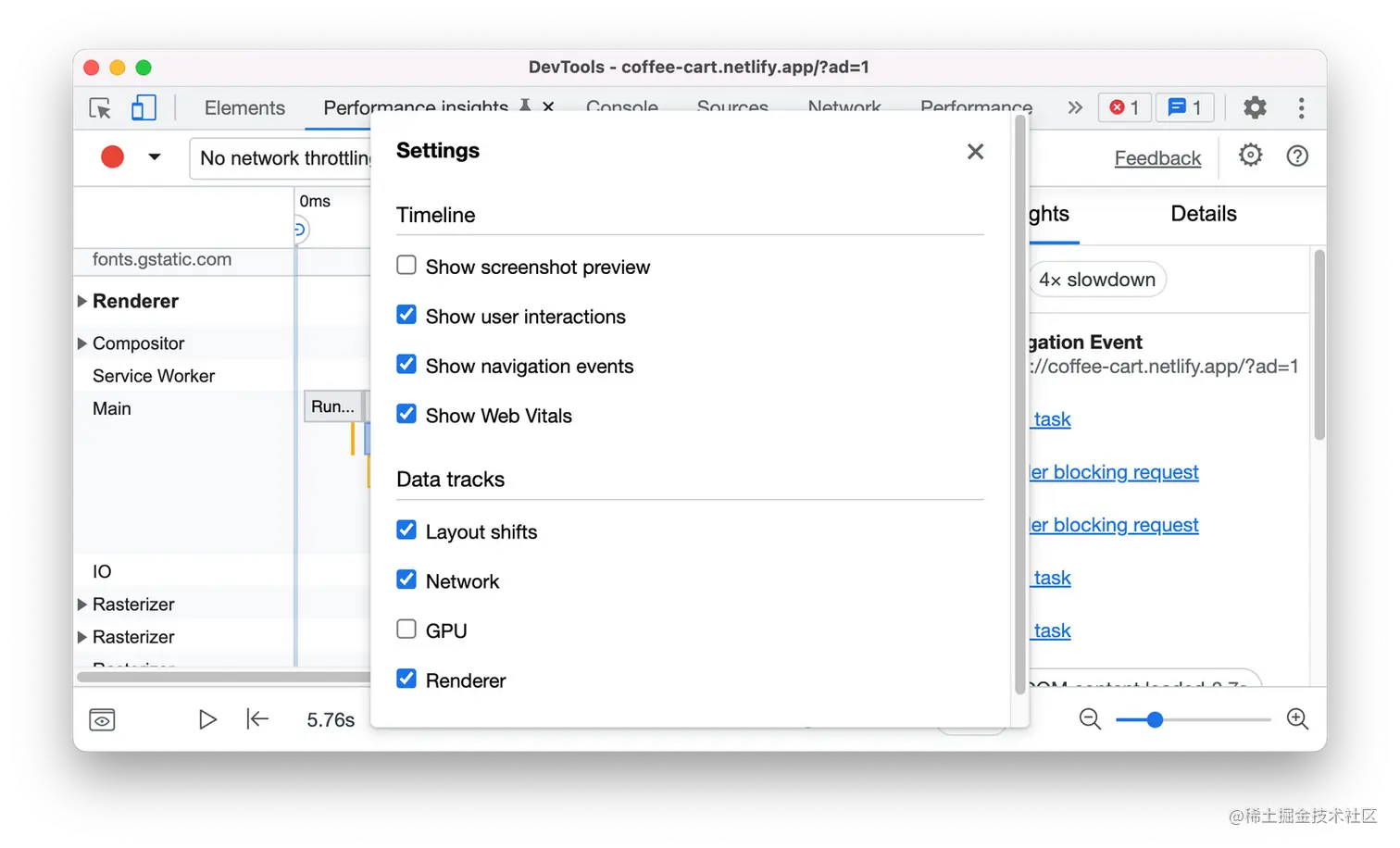 Insights面板以时间轴的形式展示了一系列性能指标,对潜在性能问题给出了提示和修复建议。