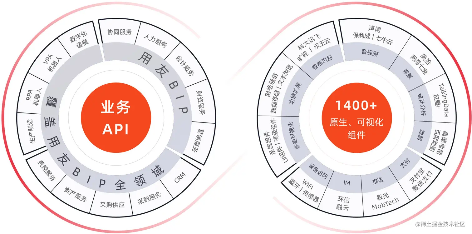 端API覆盖智能识别、音视频、客服、支付、物联网等领域的1400+原生模块,业务API覆盖用友BIP全领域,让企业应用程序构建,不受任何行业限制。