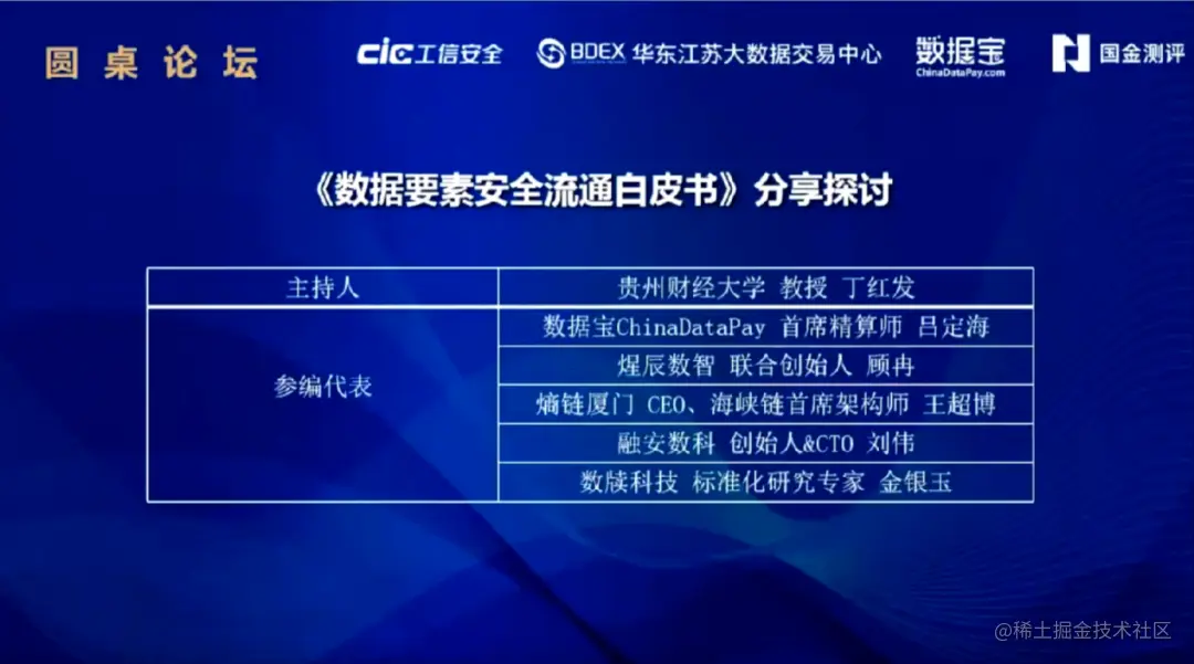 贵州财经大学教授丁红发、数据宝ChinaDataPay首席精算师吕定海、煋辰数智联合创始人顾冉、熵链科技CEO王超博、融安数科创始人&CTO刘伟、数牍科技标准化研究专家金银玉对话圆桌,共同探讨《数据要素安全流通白皮书》。