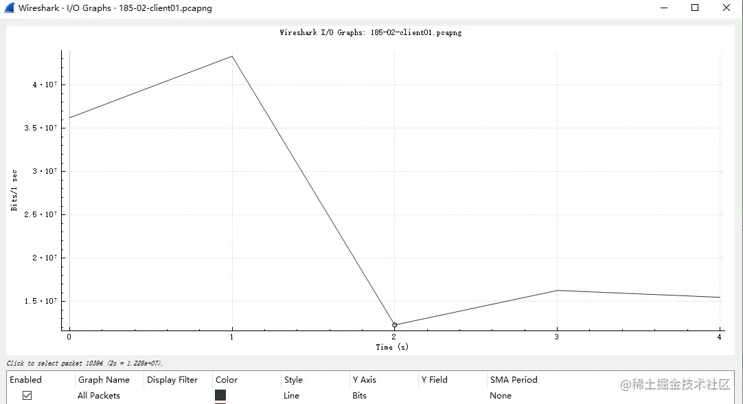 细看客户端抓包文件中的 Bytes Out 图不是很明显,因为也有可能是 ACK 数据过快。