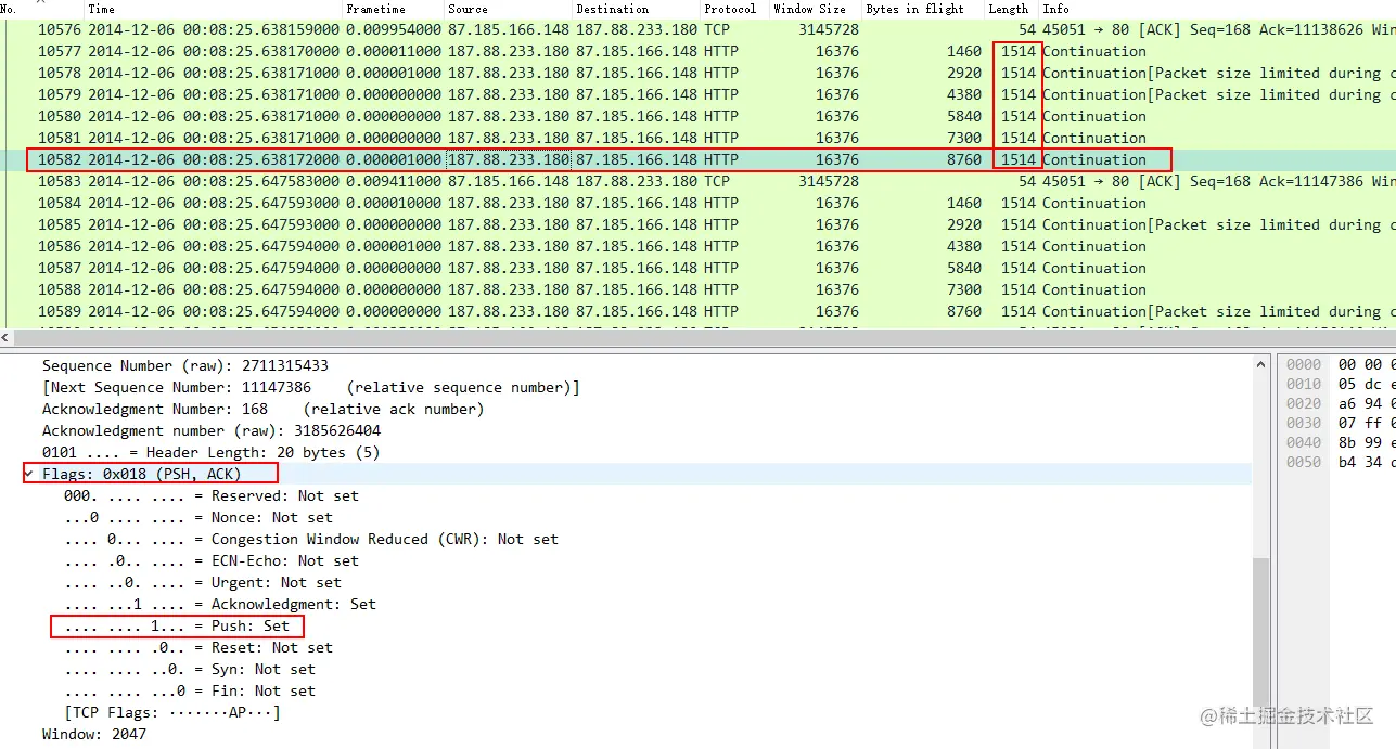 可观察到问题点的数据包,服务器每发送 6 个MSS 大小的数据包,最后一个设置 PSH 位,然后停止发送,等待客户端的 ACK,然后再次发送 6个MSS。。。循环