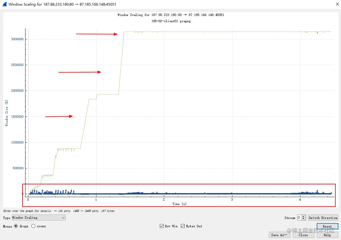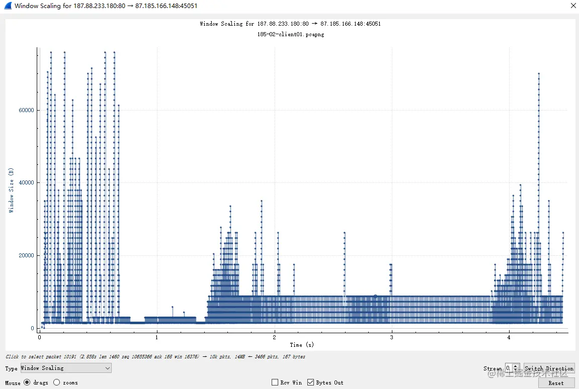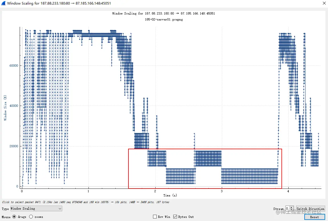 再次在服务器抓包文件中检查 Bytes Out,问题较明显。在接收端窗口容量很大的情况下,服务器发送数据的能力逐步下降,匹配下载速度慢的现象。