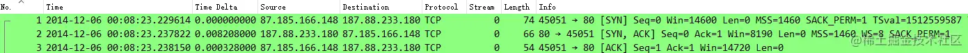 上来还是老套路,看看客户端上抓包文件中的 TCP 三次握手 。
