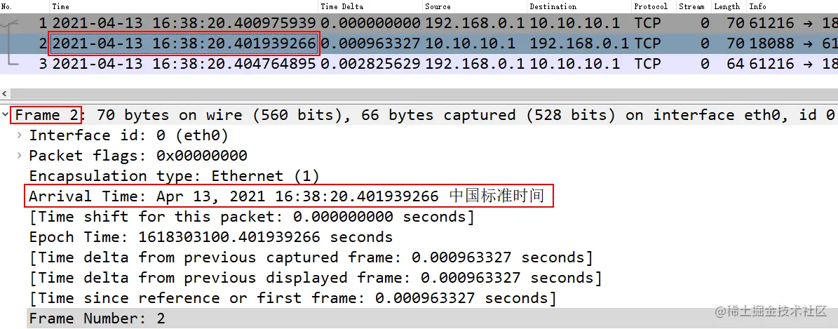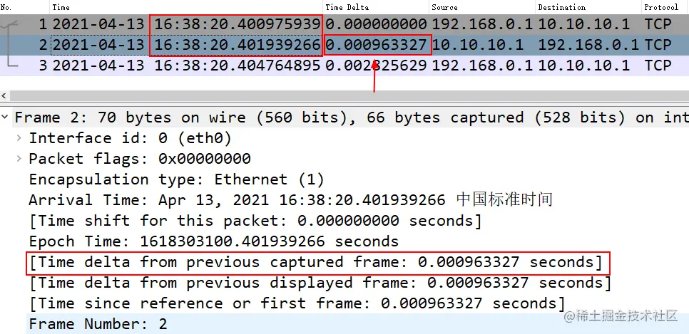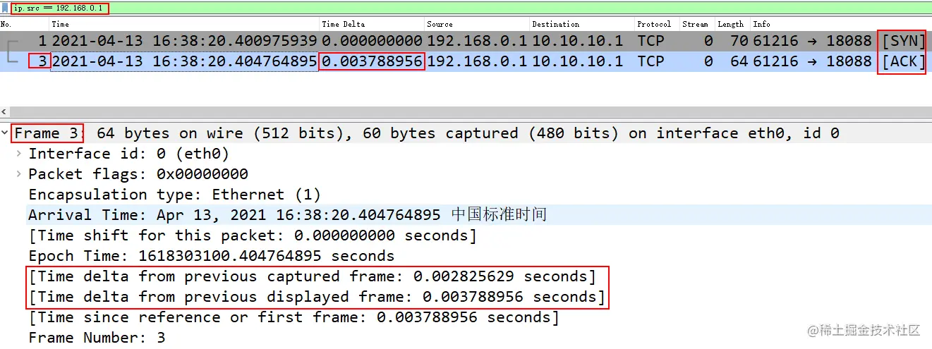 那么在帧 3 的数据包细节中,frame.time_delta_displayed 即和帧 1 (相对于帧3,为上一个显示帧)的值为 0.003788956 s。而 frame.time_delta 即和帧 2 (此处因过滤显示的原因隐藏,但实际存在,所以相对于帧 3,仍为上一个捕获帧)的值为 0.002825629 s。