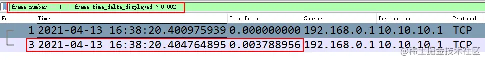 为什么帧 3 的 frame.time_delta_displayed 值为 0.0028256296 s ,但却无法成功过滤出来。
