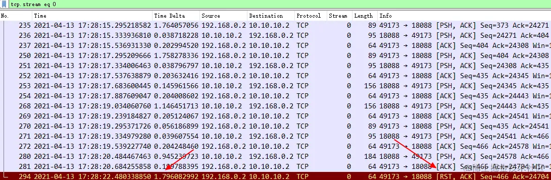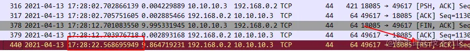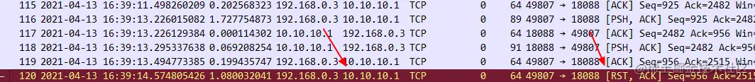 第二次根据上报的问题客户端2 IP 192.168.0.2 ,服务器 IP 10.10.10.2 以及 故障时间点(1分钟内) 进行了数据包过滤抓取,如下