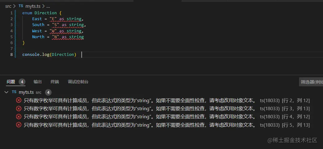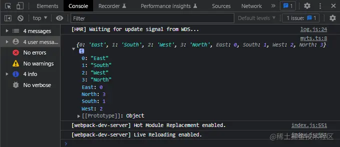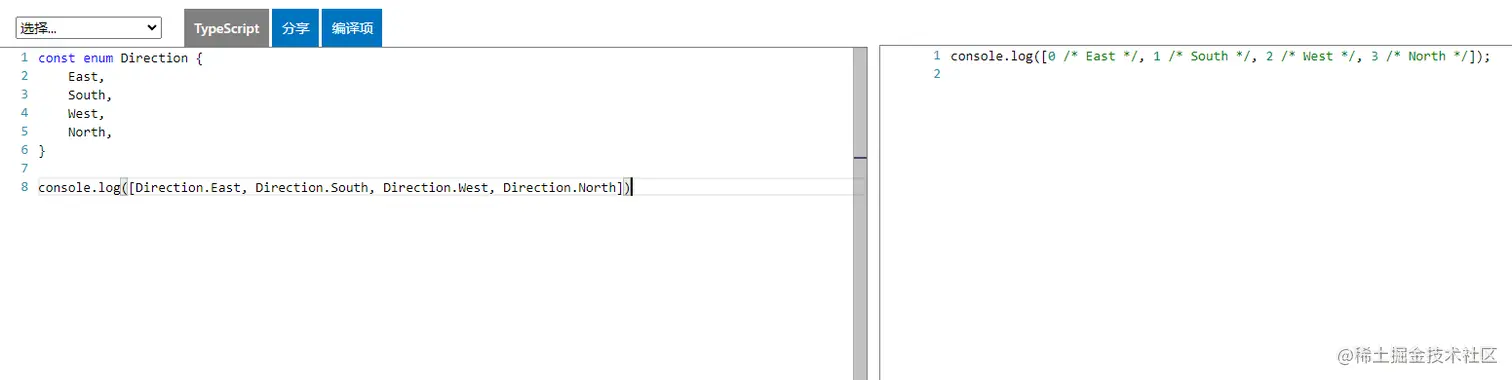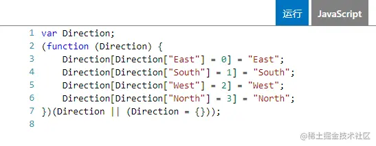 另外,还会对枚举值到枚举名进行反向映射,如枚举成员East的值是0,那么Direction[0]的值就是East