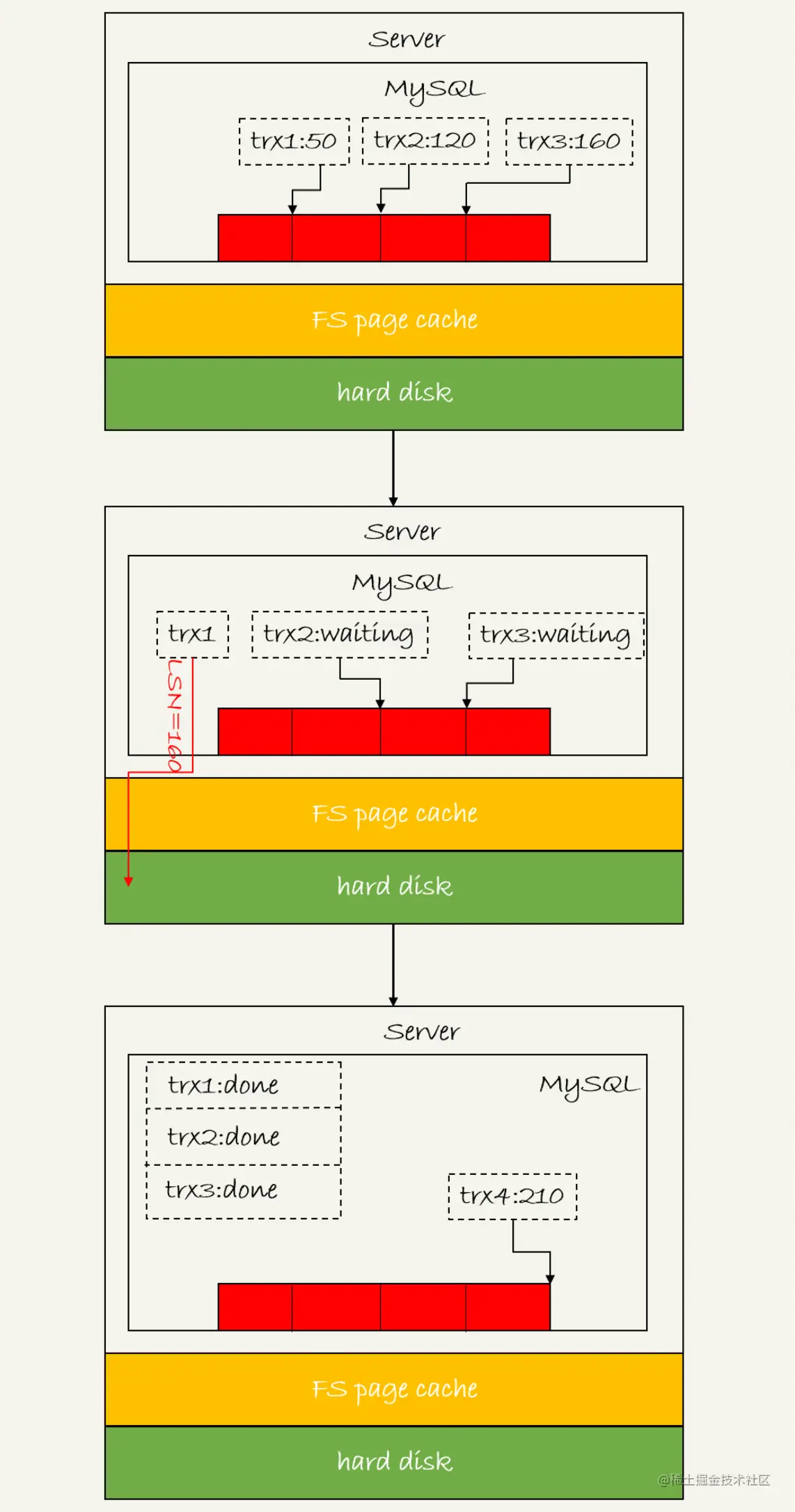 trx1第一个到达,被选为leader;trx1去写盘的时候带的是该组最大的LSN,即160,当trx1返回时,改组所有小于等于160的redo log 均被写入磁盘,trx2和trx3可以直接返回