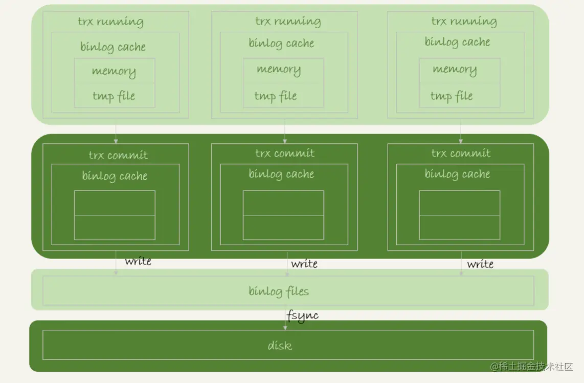 binlog_cache_size控制单个线程内binlog cache大小。如果超过这个大小就要暂存到磁盘 - 事务提交的时候,执行器把binlog cache 里完整的事务写入binlog中。并清空binlog cache。