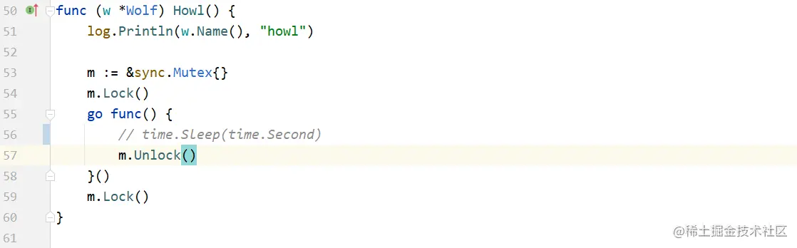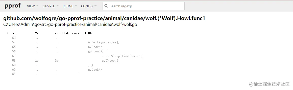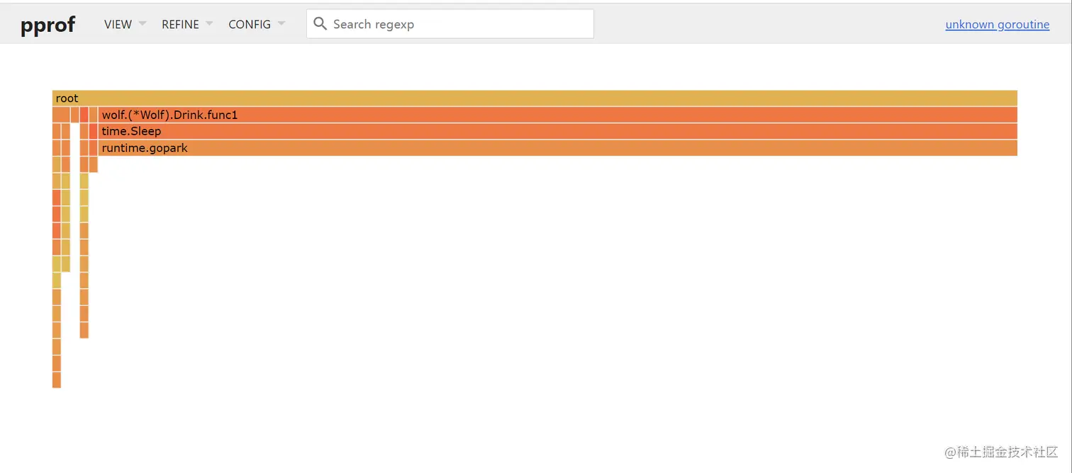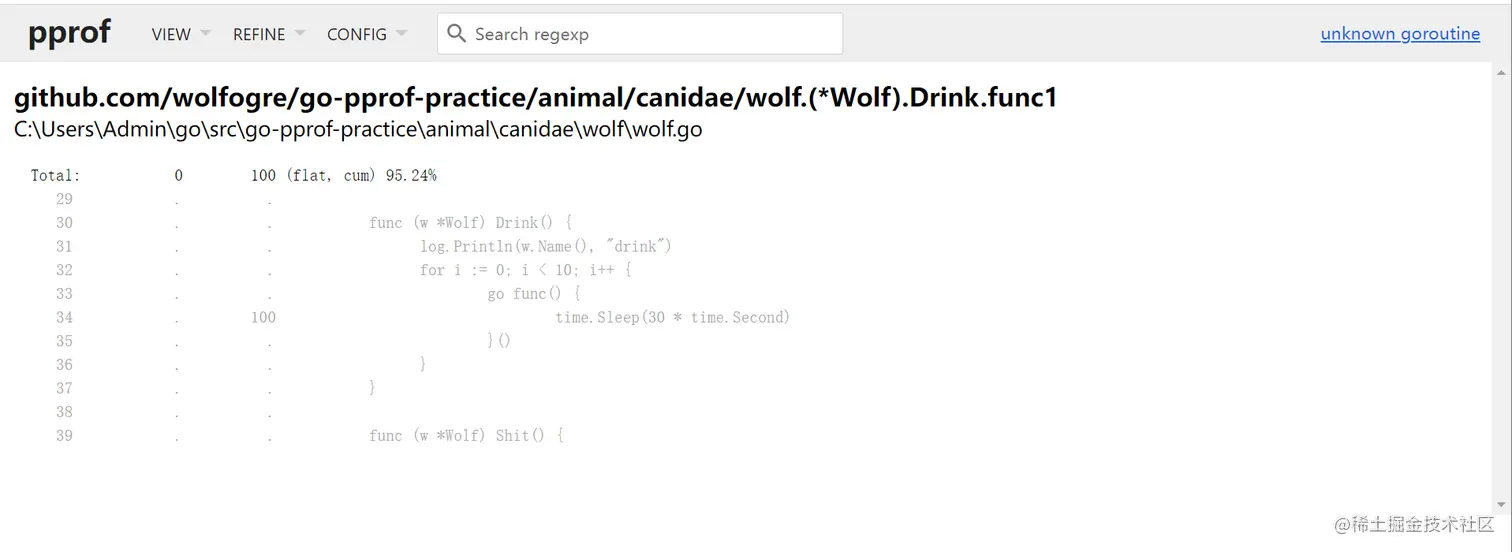 - 可以看到(*Wolf).Drink这个调用创建了超过90%的Goroutine,于是将视图切换至源码页面,通过正则搜索出Wolf相关函数。