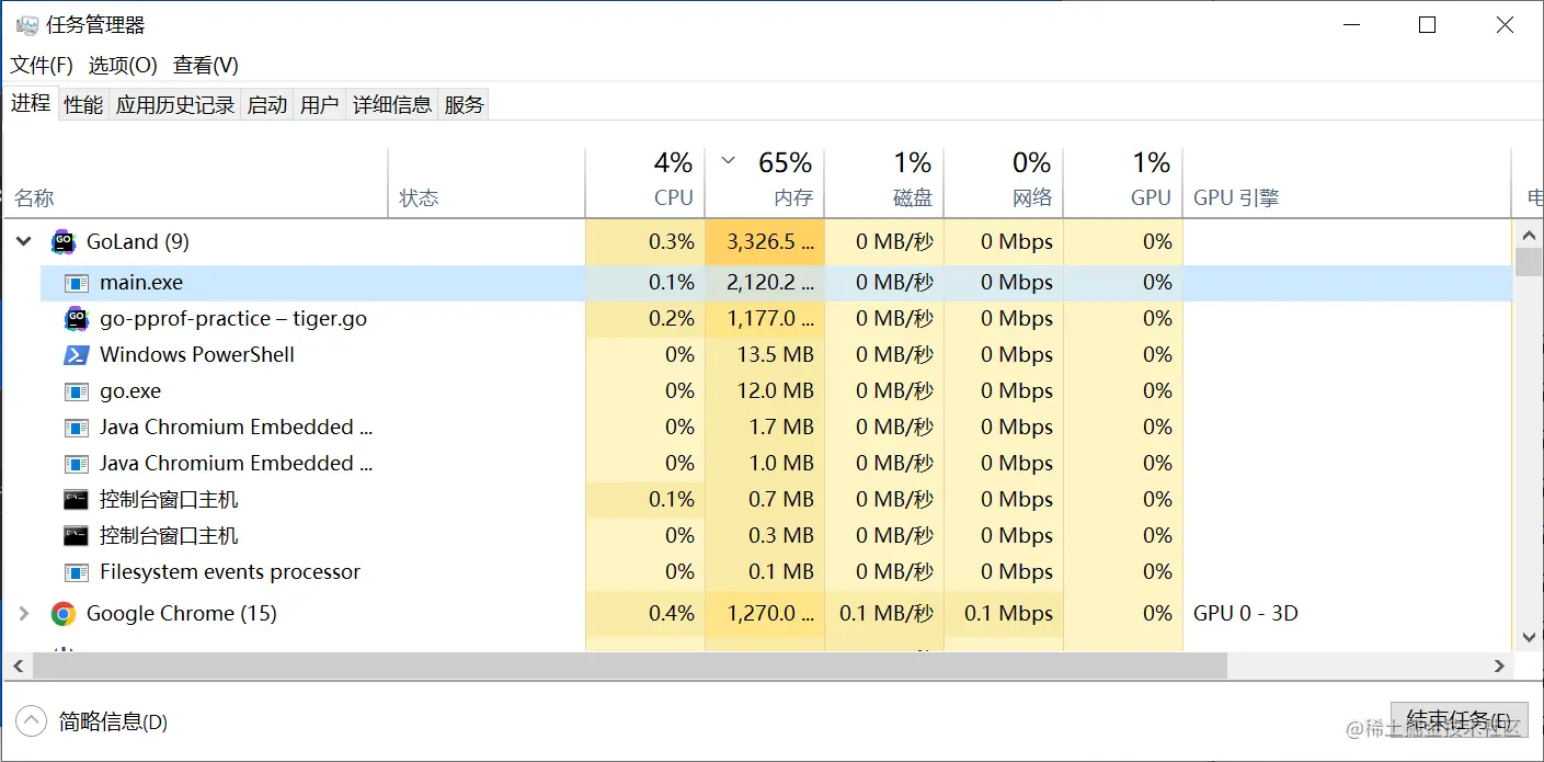 - 重新运行程序,可以发现进程CPU占用资源已经降下来了。但,内存使用还是很高,所以接下来排查内存使用异常的问题。