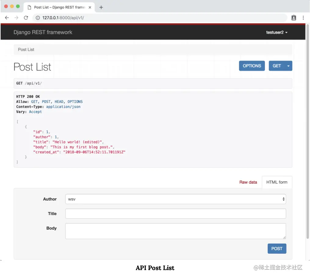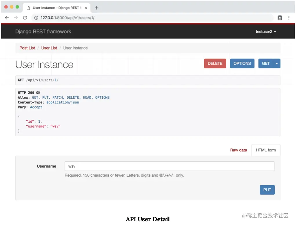 但是,局部视图有些不同。 现在它被称为“用户实例”,而不是“用户详细信息”,并且还有一个附加的“删除”选项内置于ModelViewSet中。