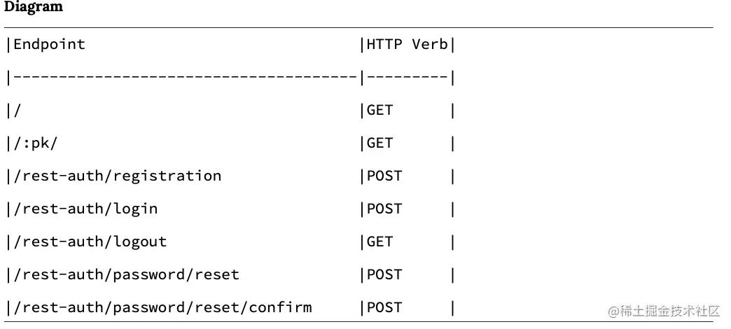 当前,我们的项目中具有以下 API 端点。 它们都以 api/v1/ 开头,为简洁起见,未显示它们:
