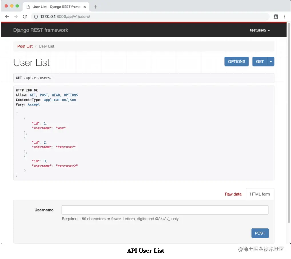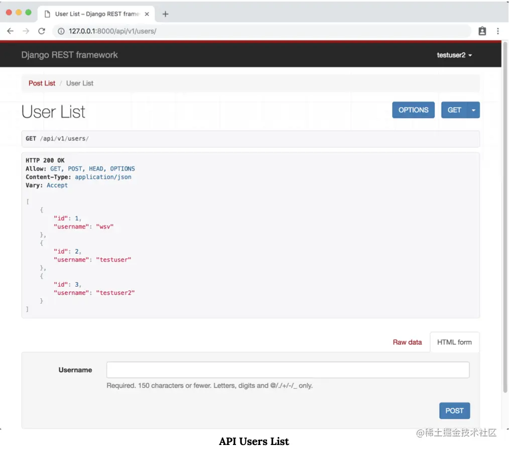 我们的用户列表端点位于 http://127.0.0.1:8000/api/v1/users/