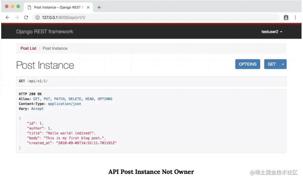 重要的是,我们的权限仍然有效。 使用我们的 testuser2 帐户登录时,Post Instance 为只读。