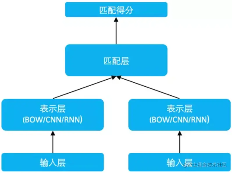 SimNet 模型结构如图所示,包括输入层、表示层以及匹配层。
