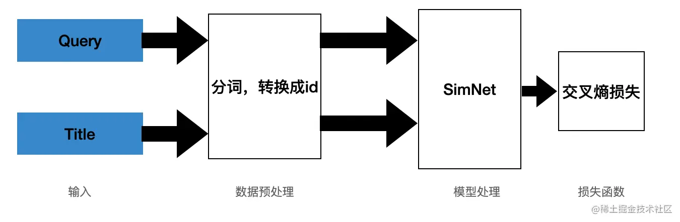 模型框架结构图如下图所示,其中 query 和 title 是数据集经过处理后的待匹配的文本,然后经过分词处理,编码成 id,经过 SimilarityNet 处理,得到输出,训练的损失函数使用的是交叉熵损失。