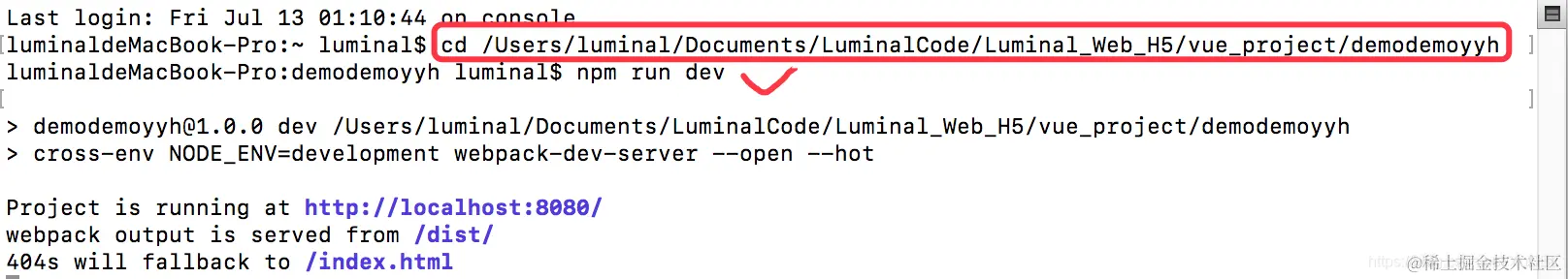 cd + 项目目录,如:cd /Users/luminal/Documents/LuminalCode/Luminal_Web_H5/vue_project/demodemoyyh