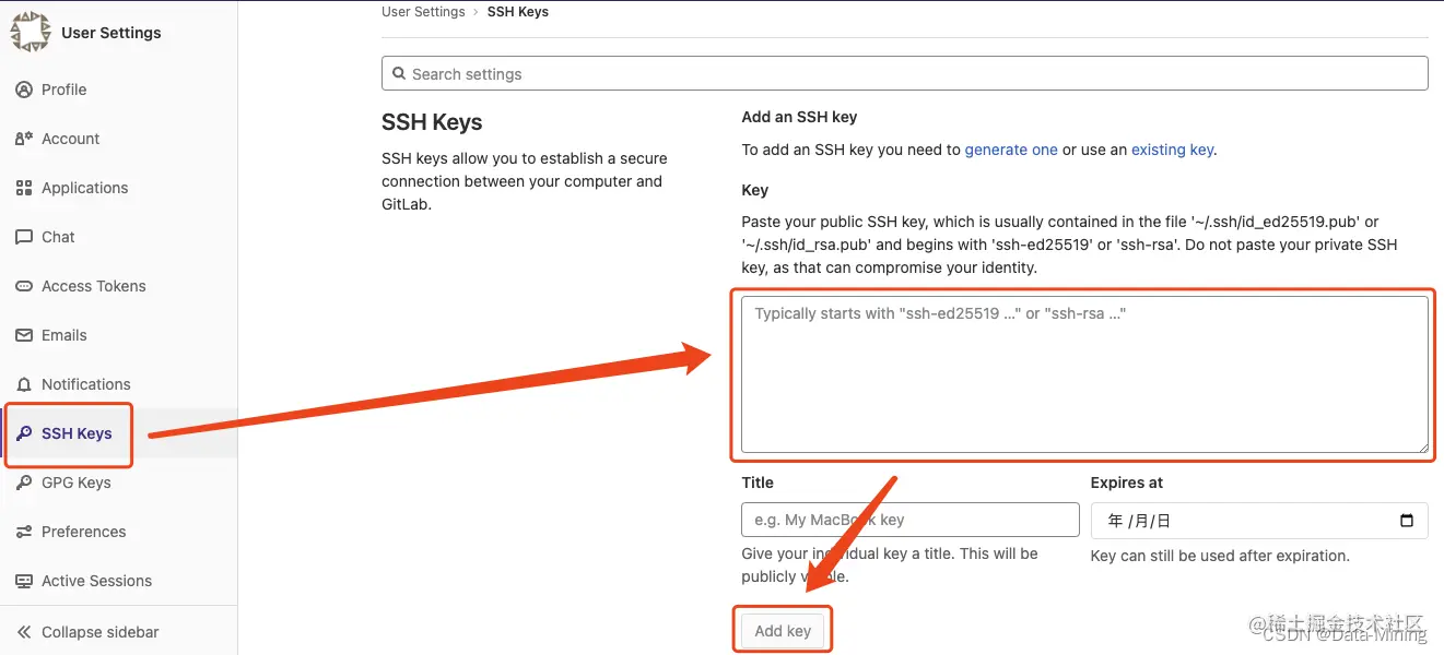拷贝 id_rsa.pub 文件中的内容到账户管理后台的 Key 编辑框中,具体操作如下图所示: