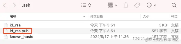 执行命令后,一路回车,执行完毕后,会在 .ssh 目录中生成 三个文件,分别是 id_rsa、id_rsa.pub、known_hosts,具体如下图所示: