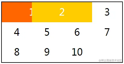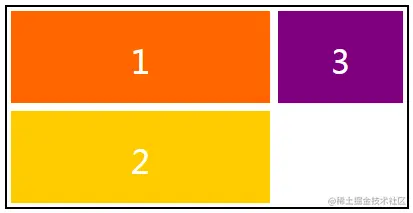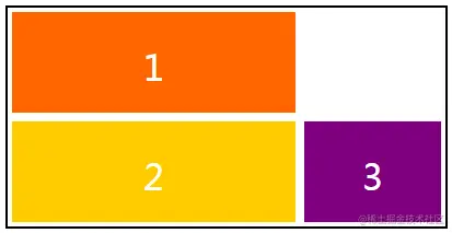 grid-auto-flow属性默认是稀疏模式,而稠密模式会尽力找出最前面的空位置。假设网格容器包含三个网格项,其中有两个会占用两个网格单元,样式如下,效果如下图所示,第一个网格项之后的网格单元闲置着。