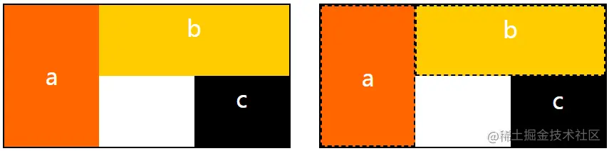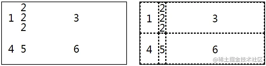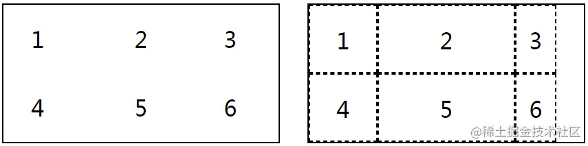下图的左侧是上述代码的效果,右侧中的虚线是生成的网格线,后文会反复使用这种格式的标注图。注意,网格线可以不与容器的边界接触,两个属性中的百分数参照的是网格容器的宽度或高度。