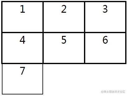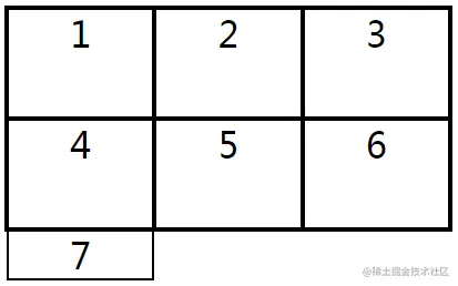 在下面的示例中,将网格容器分成两行三列,它的第七个超出边界的网格项的高度默认是内容的高度,即“height:auto”,效果如下图所示。