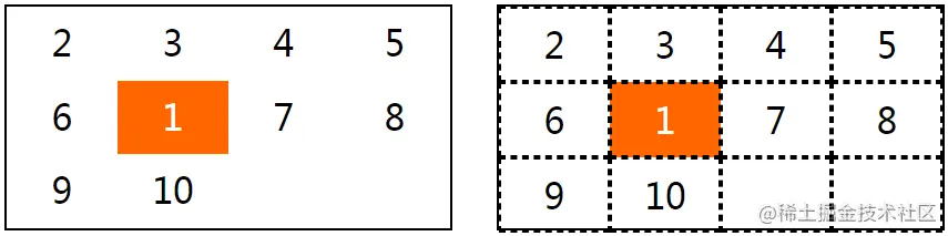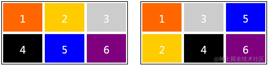 在下面的示例中,第一个div元素中的网格项会先填满一行再换到下一行,效果如图5-57的左侧;第二个div元素中的网格项会先填满一列再换到下一列,效果如下图的右侧。