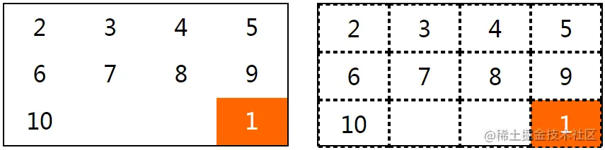 注意,由于默认跨度是1,因此可以省略grid-row和grid-column斜杠后的数字,如下所示。