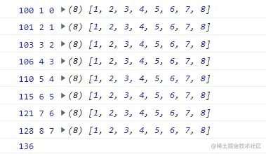 上段代码中我们使用 reduce 方法循环了数组 arr,并且设置了初始值 100,第一次执行回调函数时,previousValue 为 100,currentValue 为 1,返回结果为 101。101 作为第二次循环的 previousValue 传入回调函数,返回 101+2=103,依次类推......。
