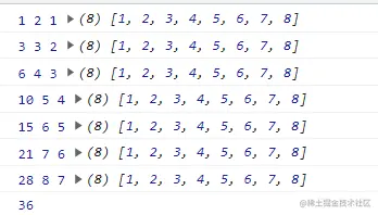 return previousValue + currentValue; // 1 + 2 + 3 + 4 + 5 + 6 + 7 + 8