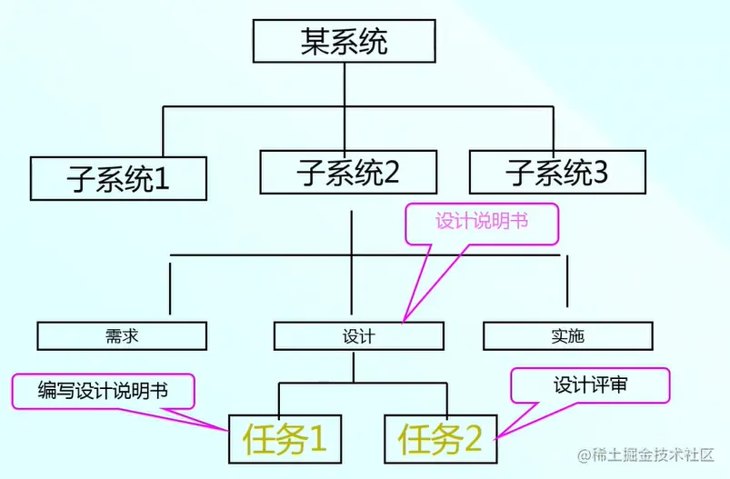 例如这是某项目的WBS,其中这个设计工作包交付成果就是设计说明书,为次需要两个任务,任务一和任务二。