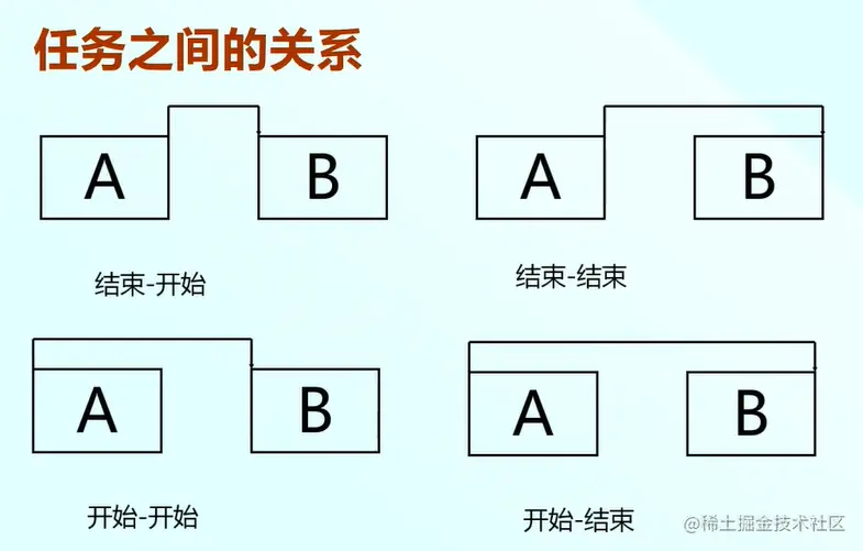任务之间的关系主要有四种逻辑关系。如图所示:其中最常用的关系是结束-开始的逻辑关系。