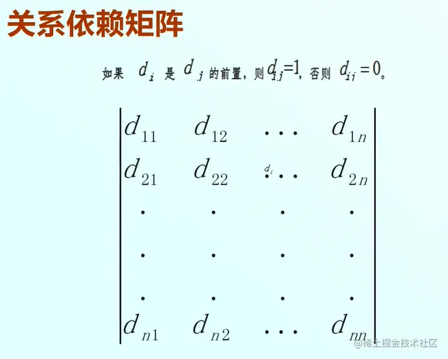 我们根据任务的依赖关系,可以确认项目任务关系依赖矩阵,例如这个图:其中d (i,j)=1,标识d(i)是d(j)的前置,否则d(i,j)等于0;