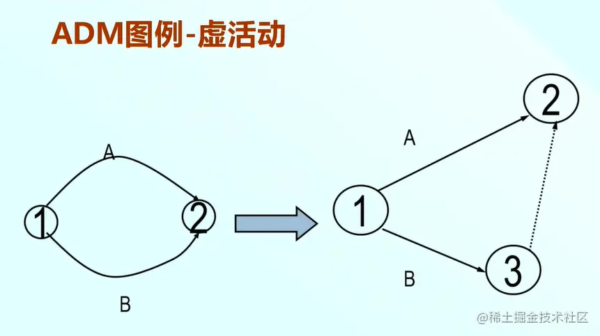 例如某活动A和B,从逻辑上都是1——2,如果我们表达成这么一个形式是不对的。所以应该增加一个3——2的一个虚活动,其中1——2是活动A,1——3表示活动B。