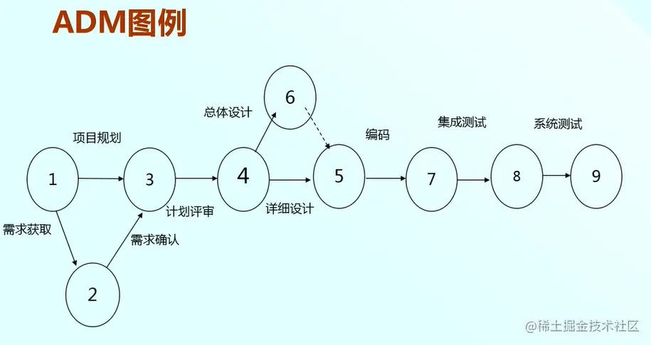 那么ADM网络图是有虚活动的,例如我们看ADM网络图当中,6——5之间虚线就是虚活动。那么虚活动不是一个真实的活动,就是为了表示逻辑关系,也不需要消耗资源的这么一个活动。