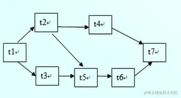 例如这是某项目的网络关系图,他说明了任务之间的关联关系,其中他t1是t2、t3的前置,通过这些关系,我们可以的得出依赖矩阵。