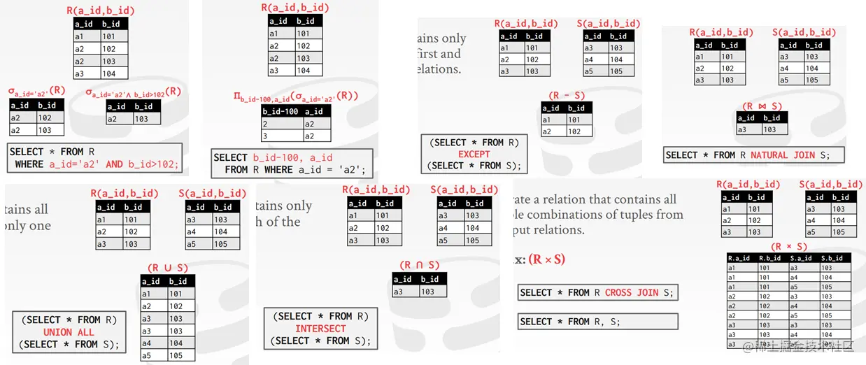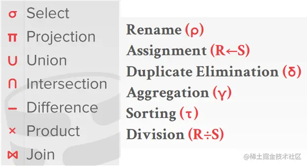 上图左边是经典的relational algebra,右边是后人总结常用操作,这里我们介绍左边的部分。符号与操作一一对应