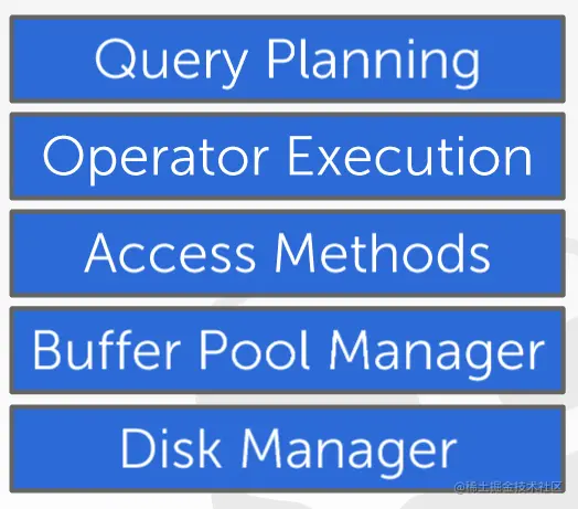 对于数据库架构,我们可以分层将数据库的架构分解为以下5个层级,分别是磁盘管理、缓存池管理、数据访问方法、算子执行、查询计划