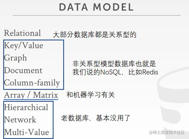 数据模型是是描述数据库中数据的一组概念,关系模型是数据模型的一种,其它还有非关系模型,具体如图