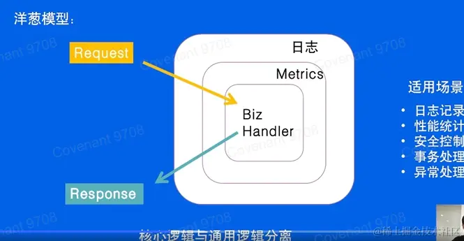 请求经过日志、metric、业务逻辑、metric、日志