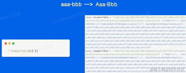 使用table存储大小写映射,O(1)复杂度即可转化大小写,比ASCII码加减效率提高40倍