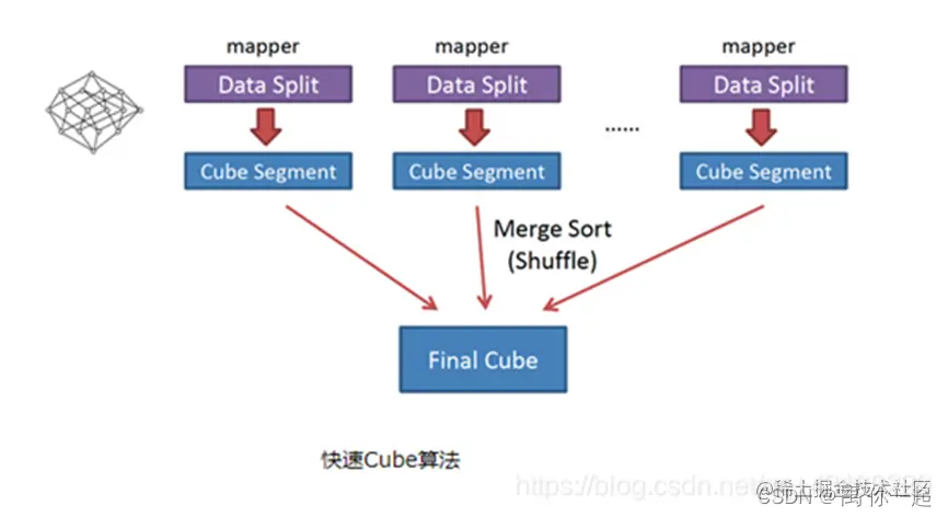 被称作“逐段”(By Segment) 或“逐块”(By Split) 算法,从1.5.x开始引入该算法,该算法的主要思想是,每个Mapper将其所分配到的数据块,计算成一个完整的小Cube 段(包含所有Cuboid)。每个Mapper将计算完的Cube段输出给Reducer做合并,生成大Cube,也就是最终结果。如图所示解释了此流程。